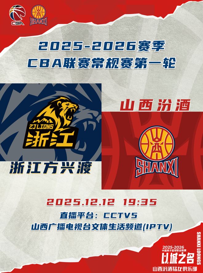 北京时间2025年12月12日19:35,山西汾酒男篮迎来2025-2026赛季CBA联赛揭幕战,客场挑战上赛季冠军浙江方兴渡。球迷观众可以通过CCTV5、山西广播电视台文体生活频道(IPTV)观看比赛实况,敬请期待!