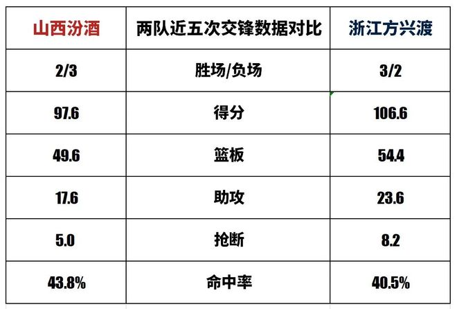 山西汾酒与浙江方兴渡历史上一共交手51次,山西汾酒18胜33负。上赛季常规赛两队交手4次,山西汾酒2胜2负。